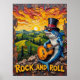 This imaginative painting portrays a shark, adorned with a top hat and cool sunglasses, unleashing a "sunset symphony" on an electric guitar from a rocky summit. The scene unfolds over rolling green hills and trees, bathed in the warm, textured light of a setting sun. The vibrant, impasto brushwork creates a powerful and whimsical atmosphere, celebrating the "ROCK and ROLL" spirit in a unique natural setting.
