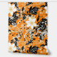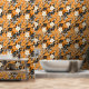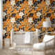 A seamless pattern featuring large white flowers, tiny white flowers, black leaves, and small black music notes on an orange background. The design has a hand-painted appearance, blending floral elements with musical motifs to create a harmonious and artistic composition.