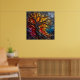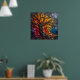 An abstract portrait of a withered tree set against a textured medium grey background. The roots, trunk, and branches stretch in opposite directions, infused with vibrant colors—shades of blood red, burgundy, blue, turquoise, orange, and yellow. Abstract lines in golden and dark brown create an engaging and artistic composition, capturing the beauty within the decay.