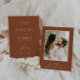 HARMONY | Terracotta. Wedding save the date photo card. Features, light beige typography, botanical greenery branch illustration detail and single photo on back.