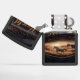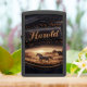 A close-up of a leather patch with the name Harold embossed on it. Beneath the name, a painted scene depicts a horse running through a field at sunset with a barn in the background.