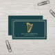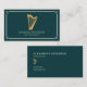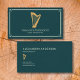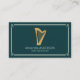 A business card featuring a golden harp illustration with a stylized frame, on a forest green background. A great option for harpists, musicians, teachers, instructors, and concerts.