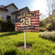 A vibrant yard sign promotes the candidacies of Harris and Walz for the 2024 election, featuring bold lettering against a backdrop of an American flag.