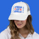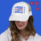 Retro Harris & Walz red, white and blue White Trucker Hat. Red flowers and 2024 on either side.