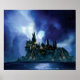 Hogwarts Castle lit up with moonlight on a magical evening. This Harry Potter School for witchcraft and wizardry is the perfect design to really stand out as a Potterhead. A painting styled with a vintage look of the moonlight, sky and castle itself on a hill. This magic wizard school is where many wonderful memories are held for millions of fans of the beloved J.K. Rowling children's book series.