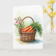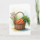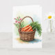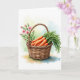 This design shows a warm brown woven basket centered in the scene, its tight strands and curved handle drawn with careful texture. Inside, several rounded orange root vegetables sit close together, their smooth surfaces catching soft highlights as if just picked. Lush green tops spill outward in loose arcs, and the way the leaves lean into one another gives the arrangement a cozy, friendly closeness 🐰. Behind the handle, a small spray of pale pink blossoms rises on thin green stems, with a couple of buds tucked near the flowers like a quiet, affectionate gesture 🌷. Near the top, a short greeting line is placed in a gentle, medium-sized font, set in a muted gray-green that doesn’t overpower the artwork. The background stays airy with light washes of pale green, soft blue, and warm beige, blending like watercolor to keep the focus on the basket. Subtle shadows sit beneath the basket and along the vegetable curves, while the pink flowers angle slightly to the right behind the handle.