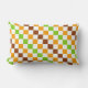A vibrant checkered pattern of alternating green, orange, and brown squares on a white background. The design creates a lively, geometric feel.