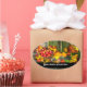 A colorful harvest time sticker with fruits and vegetables, flowers and leaves by a wooden fence, add the text of your choice.