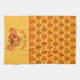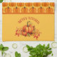 Fun Fall Pumpkin Harvest towel has a pattern of pumpkins at the top against a mustard yellow background. The bottom has a display of pumpkins and fall leaves. A modern font is used to personalize the apron with your name. There is also another kitchen towel, an oven mitt and pot holder set and a coordinating apron, so you can bring the Fall season right into your kitchen!