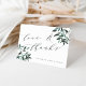 Chic autumn botanical thank you notes let you express your gratitude to your wedding guests in elegant style. Front features "love and thanks" in off-black calligraphy lettering accented with watercolor foliage in shades of hunter, forest and sage green. Personalize with your names along the bottom, and customize the inside with a custom pre-printed message and signature as well as a favorite wedding photo. Designed to coordinate with our Harvest Sage wedding and event stationery collection.