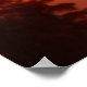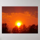 We see the sun and its fiery brilliance light up the sky with colors of purple and orange as it exits behind the treeline for the evening in this print.