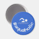 A single pictogram swimmer and the caption #aquaholic make this a fun magnet for anyone who loves swimming and other water sports. In a light silvery gray on a bright blue background. Circle or square options available.