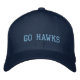 Hat shown in navy blue with blue embroidered text: Go Hawks Customize this item or buy as is.