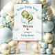 Modern baby shower paper plates with a cute baby dinosaur on the clouds in blue and green. Easily personalize the text. - Kate Eden Art