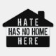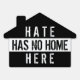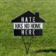 This black and white lawn sign features distressed text that reads: Hate Has No Home Here.