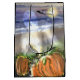 This graphic art design features fall season orange pumpkins, comical, funny, freaky, scary, ghoulish see through transparent white ghost, tan sand sandy beach, rolling ocean waves crashing onto the shoreline.