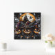 Three carved pumpkins glow eerily against a full moon, overlooking a haunted castle with bats and a witch flying in a dark, atmospheric Halloween night.
