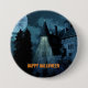 Halloween themed design features artistic digital painting of scary haunted Gothic mansion on the hill with dark blue and gray skies. Customizable grunge style orange text overlay