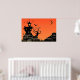 This image depicts a classic Halloween scene. A spooky, haunted house stands atop a hill, with bats flying around it. A gnarled, twisted tree stands beside the house, and smoke rises from the ground nearby. A graveyard with tombstones and crosses is visible in the foreground. The sky is a fiery orange, and a crescent moon hangs in the distance. The overall atmosphere is eerie and mysterious, perfect for the Halloween season.