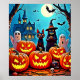 Prepare for a spine-tingling Halloween adventure with this captivating image. A masterpiece crafted by AI and refined by a skilled artist, this unique design brings to life the enchanting spirit of the season. Grinning jack-o'-lanterns cast an eerie glow, while a mysterious witch and her black cat stand guard before a haunted house. Bats soar across a moonlit sky, adding to the spooky ambiance. Perfect for anyone seeking a truly unique and artistic take on the Halloween holiday, this image is a testament to the blend of technology and human creativity.