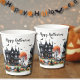 Get into the Halloween spirit with these charming paper party cups! Featuring "Happy Halloween" in a cute script typography at the top on both sides, the design showcases three black haunted houses adorned with pops of orange from pumpkins, jack-o-lanterns, and spooky trees. The classic black and white color scheme, combined with the whimsical script, strikes the perfect balance for both adult and kids' Halloween celebrations. These cups are designed to bring a touch of fun and festivity to your costume party or spooky event, making them a delightful addition to any Halloween gathering! Haunted House Halloween Party Paper Cups Fun Festive Spooky Black Orange White Vintage House