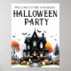 Welcome your guests with this spooky and stylish party sign! Featuring "Welcome to the [Your Name] Halloween Party" in a mix of classic serif fonts and a distressed vintage grunge style, the design appears on both the front and back of the sign. A haunted house sits at the center of the black and white layout, accented with pops of orange from pumpkins, jack-o-lanterns, and creepy trees. Playful ghosts and bats complete the eerie vibe, making this sign perfect for creating a fun, vintage-inspired Halloween atmosphere as your guests arrive. A great way to set the scene for your spooky celebration! Haunted House Halloween Party Sign Cute Bats Ghosts Pumpkins Black White Orange