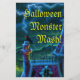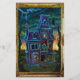Spooky haunted house portrait scene with monsters creeping through the house, spooky eyes in trees on a Halloween night. A haunted owl is perched on the dead tree overlooking the electric storm approaching! Illustrated cartoon house features blue, green and red tones.