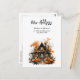 Postcard moving announcement with a cool and spooky illustration of a wooden haunted house. Surrounded by big orange pumpkins and trees with orange leaves. Windows with orange lights add a nice glow. Fun Halloween design.