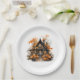 Paper plates with a cool and spooky illustration of a wooden haunted house. Surrounded by big orange pumpkins and trees with orange leaves. Windows with orange lights add a nice glow. Fun Halloween design.