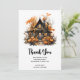 Thank you card with a cool and spooky illustration of a wooden haunted house. Surrounded by big orange pumpkins and trees with orange leaves. Windows with orange lights add a nice glow. Fun Halloween design.