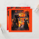 Haunted mansion Halloween Party Invitation featuring Frankenstein, witch, and Edgar Allen Poe standing in front of stone fireplace with roaring Halloween style fire. Laughing pumpkins, monsters, and plenty of candles burning with also a candelabra by artist, Patricia, in cartoon style. Backside features Frankenstein personally inviting you to his party and lines for you to fill in your information. Hope your party will be a great big success.