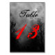A custom double-sided table card with grunge script text front and back and art of a spooky Halloween sky with misty trees along a dark haunted road, gothic ravens and a cloudy full moon in black, white and gray.. Customize It to change fonts, colors, even save your design for later.