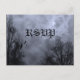 A custom RSVP postcard with a background of a spooky Halloween sky with misty trees along a dark haunted road, gothic ravens and a cloudy full moon with a blue mist. The front has RSVP in a black gothic font, the back has room for your custom dates and return address. Click Customize it to change fonts, sizing, text and more, even save your design for later.