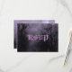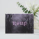 A custom response RSVP card template with grungy script and traditional gothic letters on a spooky Halloween sky with misty trees along a dark haunted road, ravens and a cloudy full moon and a purple tint. Click Customize It to change fonts, sizing and more, even save your design for later.
