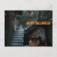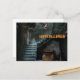 Halloween themed postcard features artistic digital painting of a haunted staircase complete with ghost, cauldron, owl and candelabra. Customizable grunge style text overlay