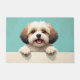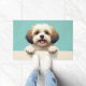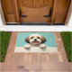 The soft pastel turquoise background adds a bright and refreshing touch, perfect for welcoming entryways. Designed with extra space at the top and bottom, it allows easy personalization with names, welcome messages, or custom text—making it ideal for unique dog-themed doormats and thoughtful gifts.