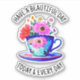 Pretty blue China tea cup of pink flowers with the quote, "Have a beautiful day today and every day."