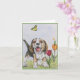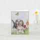 A birthday card with a joyous beagle puppy among Spring flowers. One flower sports a birthday candle.
