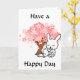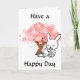 This card has two cute bunnies sitting under a pink leaved tree. The front says, "Have a Happy Day," and the inside says, "Just wanted to say, "hi" and have a wonderful day." A cute polka dotted heart is on the back of the card. You can edit the text to say whatever you'd like in the customization area if you want to change it.