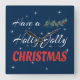 Have a Holly Jolly Christmas text design with stars, berries, candle and winter evergreen decoration on dark blue background