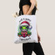 Adorable cartoon frog in Santa hat holding a Christmas gift holiday tote bag.
