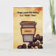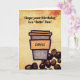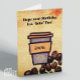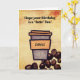 Customisable birthday card featuring a disposable coffee cup set against a rustic background sprinkled with coffee beans.