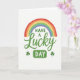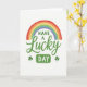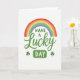 This greeting card centers on bright green text reading “HAVE A Lucky DAY,” set on a white background that keeps everything crisp and easy to see. “HAVE A” sits above in simple green letters, while “Lucky” appears in a smooth, flowing green style that feels like a friendly note passed between close friends 💚. A rainbow arches over the words in red, orange, yellow, green, blue, and purple, with slightly uneven edges that make it feel warmly drawn by someone who cares. Two small three-leaf shamrocks sit on either side of “DAY,” like little matching tokens shared between two people ☘️. The word “DAY” is placed inside a light green rectangular banner with a soft, grainy texture that adds depth. The layout is balanced and open, with plenty of white space around the rainbow and lettering so the colors stand out without crowding. The rainbow’s curved bands sit directly above the message, and the green banner neatly frames “DAY” beneath it.