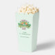 Popcorn favor boxes with a St. Patrick's Day themed image. A retro grunge style design which says: Have a lucky day. With a colorful rainbow behind. Words written in a fat rounded retro style vibe. Pink and green colors.