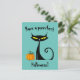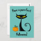 Halloween greetings for all your cat-loving friends, witches, and warlocks! Trending teal background, stylish black cat, orange pumpkin