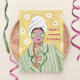 Colorful Modern Woman with a towel around her head, cucumber on her eyes, a pink mask and wearing a sage green striped pyjama for your birthday wishes. She drinks a healthy cocktail and the yellow wall paper in the beauty center features little white daisy flowers. Original artwork by Caroline Bonne Müller