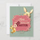 Light green bead board background, well decorated pink and yellow framed sign that reads: Have a spEGGtacular Easter. Adorned with a golden yellow ribbon on lower left corner and the cutest bunny rabbit face popping up from behind sign at top right corner.