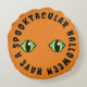 This round pillow has holiday message for your guests. The center has green eyes and message, in orange, reads "Have A Spooktacular Halloween". The back is orange, with black text.