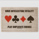 Showcase your wry duplicate bridge sense of humor and attitude with this fiber doormat featuring the four card suits along with the following bridge advice: "Have Intellectual Vitality Play Duplicate Bridge". Memorable bridge advice fiber doormat for any duplicate bridge player or teacher!