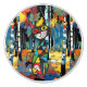 A whimsical cat with a geometric, stained-glass appearance stands in a vibrant forest of birch trees. The background features a colorful blend of autumn leaves and hues of blue and yellow. Digital Art Photoshop